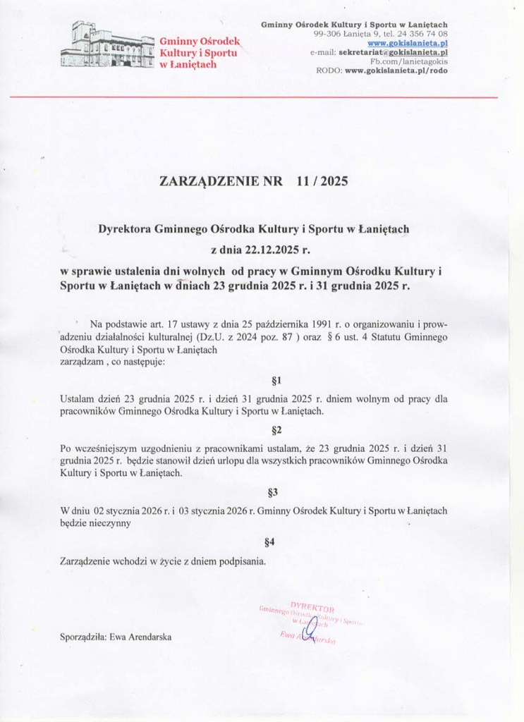 Zarządzenie nr. 11/2025 dyrektora GOKiS z dnia 22.12.2025 r w sprawie ustalenia dni wolnych w dniach 23 grudnia 2025 r. i 31 grudnia 2025 r. gokisbip | 23 grudnia 2025 | Bez kategorii | Brak komentarzy Related Posts Informacja o wynikach naboru na Głównego Księgowego Brak komentarzy | kwi 22, 2025 ZARZĄDZENIE NR 14/2020 DYREKTORA GMINNEGO OŚRODKA KULTURY I SPORTU W ŁANIĘTACH Z DNIA 21.12.2020 ROKU Brak komentarzy | gru 21, 2020 Zarządzenie nr 4/2025 Dyrektora Gminnego Ośrodka Kultury i Sportu w Łaniętach z dnia 22.04.2025 r. w sprawie ogłoszenia naboru na stanowisko Głównego Księgowego w Gminnym Ośrodku Kultury i Sportu w Łaniętach Brak komentarzy | kwi 22, 2025 Zarządzenie nr 3/2025 Dyrektora Gminnego Ośrodka Kultury i Sportu w Łaniętach z dnia 08.04.2025 r. w sprawie ogłoszenia naboru na stanowisko Głównego Księgowego w Gminnym Ośrodku Kultury i Sportu w Łaniętach Brak komentarzy | kwi 8, 2025 About The Author gokisbip